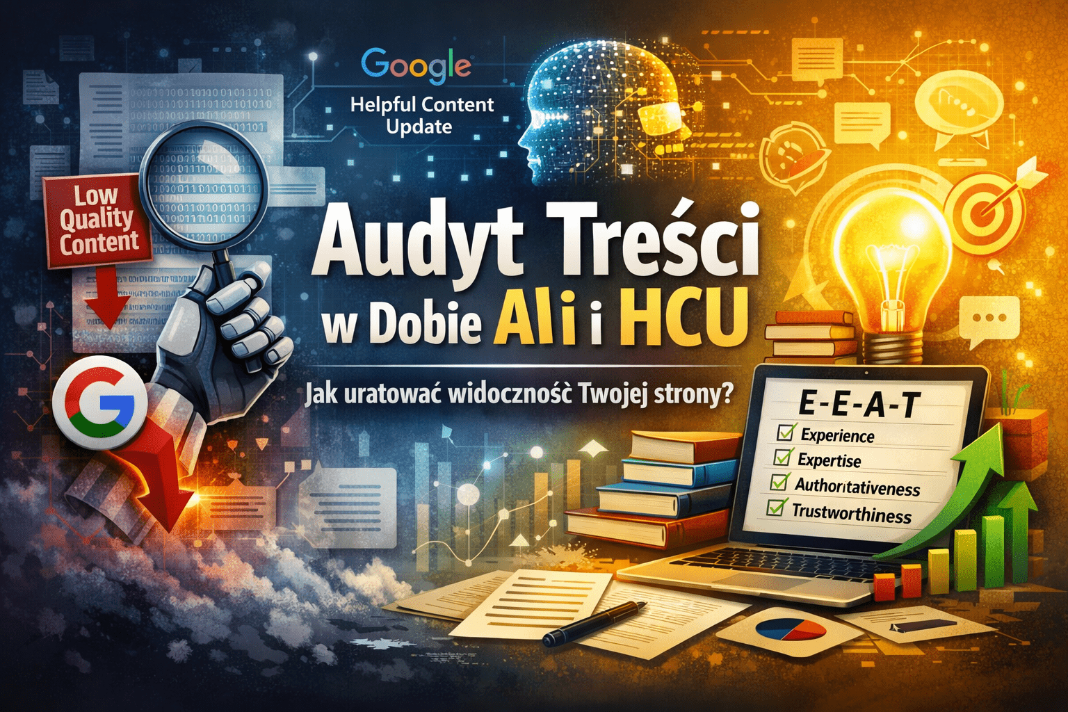 W świecie SEO, który pędzi jak szalony, ostatnie lata przyniosły trzęsienie ziemi. Mowa tutaj o wstrząsach wywołanych przez aktualizacje Google, zwłaszcza słynny Helpful Content Update (HCU), a do tego doszły błyskawicznie rosnące wymagania sztucznej inteligencji. Dziś content nie może być już tylko „SEO-friendly”. Musi być przede wszystkim helpful, czyli naprawdę pomocny i wartościowy dla człowieka. Jeśli Twoja strona ma problemy z widocznością, najprawdopodobniej przyszedł czas na gruntowny audyt treści. Chodzi o to, żeby zidentyfikować, usunąć i naprawić content, który Google określa jako niskiej jakości, a który w erze AI przestaje mieć rację bytu.